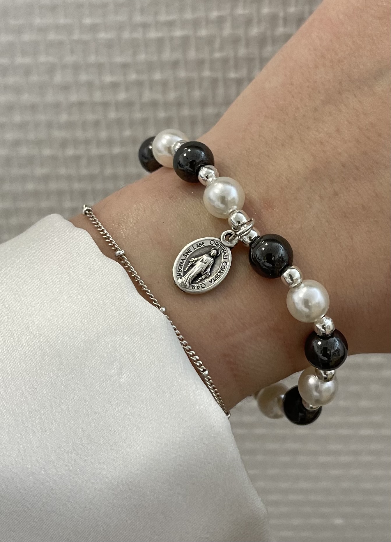 Bracelet mini médaille miraculeuse en plaqué or et en argent sur chaîne perlée.